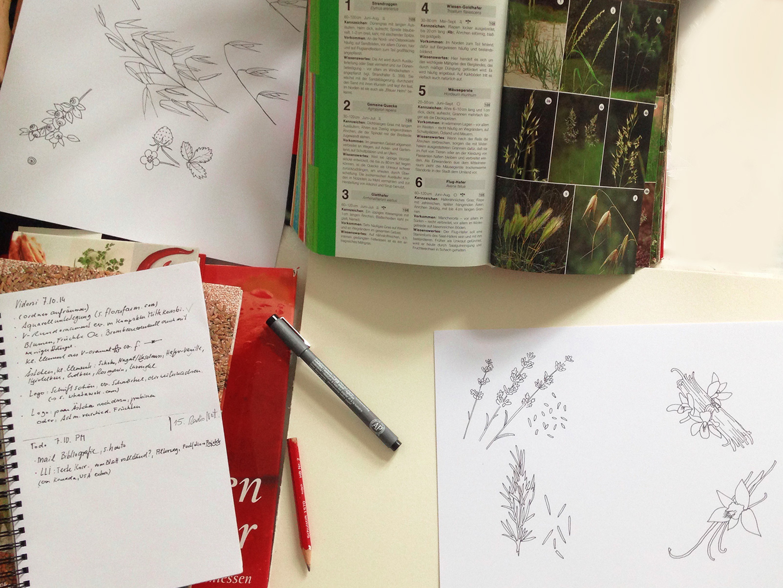 Nach Analyse, Briefing und Konzept gehts an die Gestaltung. Die grafische Gestaltung beginnt mit Erstellung eines Moodboards, es folgt die Erstellung von Illustrationen, Schriften, Muster, Ornament, Logo.